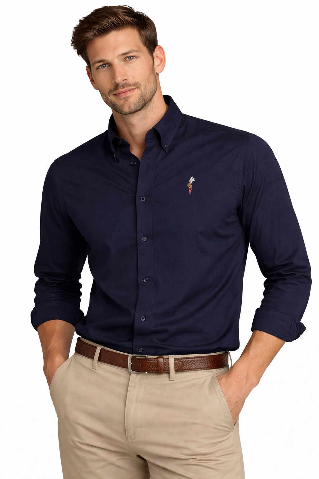 Camisa con bordado tela Popelín que destaca por su resistencia y tacto sedoso. Camisa de manga larga con botones en el cuello. Disponible desde la talla S hasta la 4XL. Apta para todas las estaciones del año.